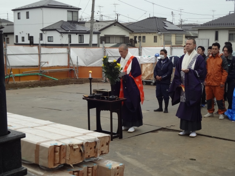 4月の工事は、工事の安全をお祈りする立柱式が行われたのち、