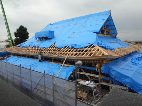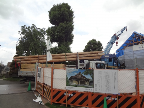 大きな材木がまだまだ運ばれてくることに驚きです!!屋根板が入りブルーシートが外されるとより荘厳さがでてきました。