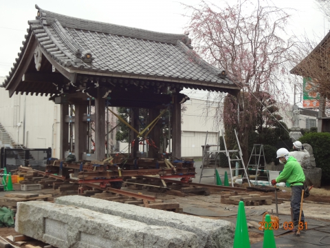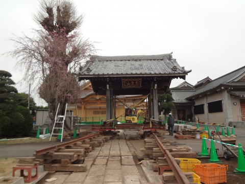 山門の位置をずらすことによって外側を通れるようにする工事です。