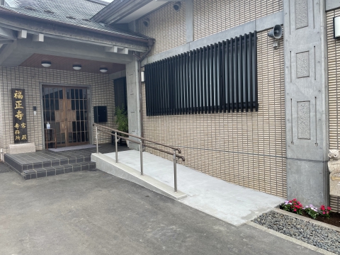 近年、階段の上り下りが大変そうな方が増えており、かねてより懸案事項となっていた客殿の玄関前にスロープを設置いたしました。